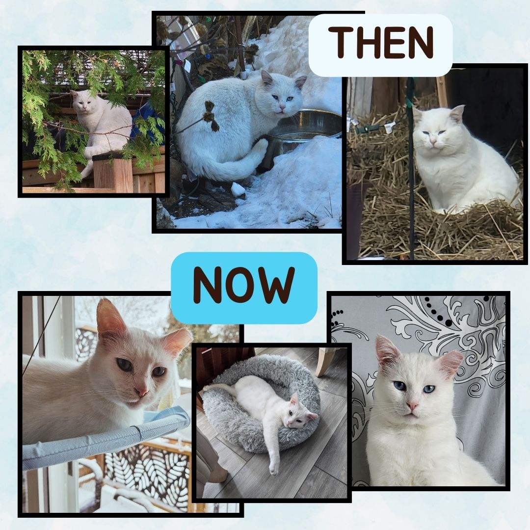 Ghost was once a feral outdoor cat with no hope and a broken leg. He was highly anxious, distrustful, and not used to the human touch. He's now a happy indoor boy with our loving family.